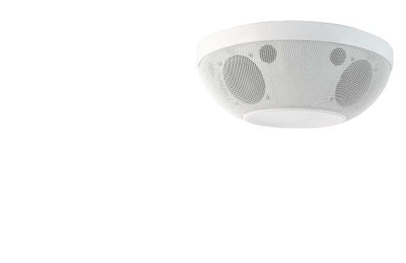リスニング評価・講義室・会議室用スピーカー 音質や音圧の偏差なく全方位に明瞭な音を届ける無指向性スピーカーで、多様な音源入力方式や軽量・小型のワイヤレスマイクを採用することで、ユーザーの利便性を向上